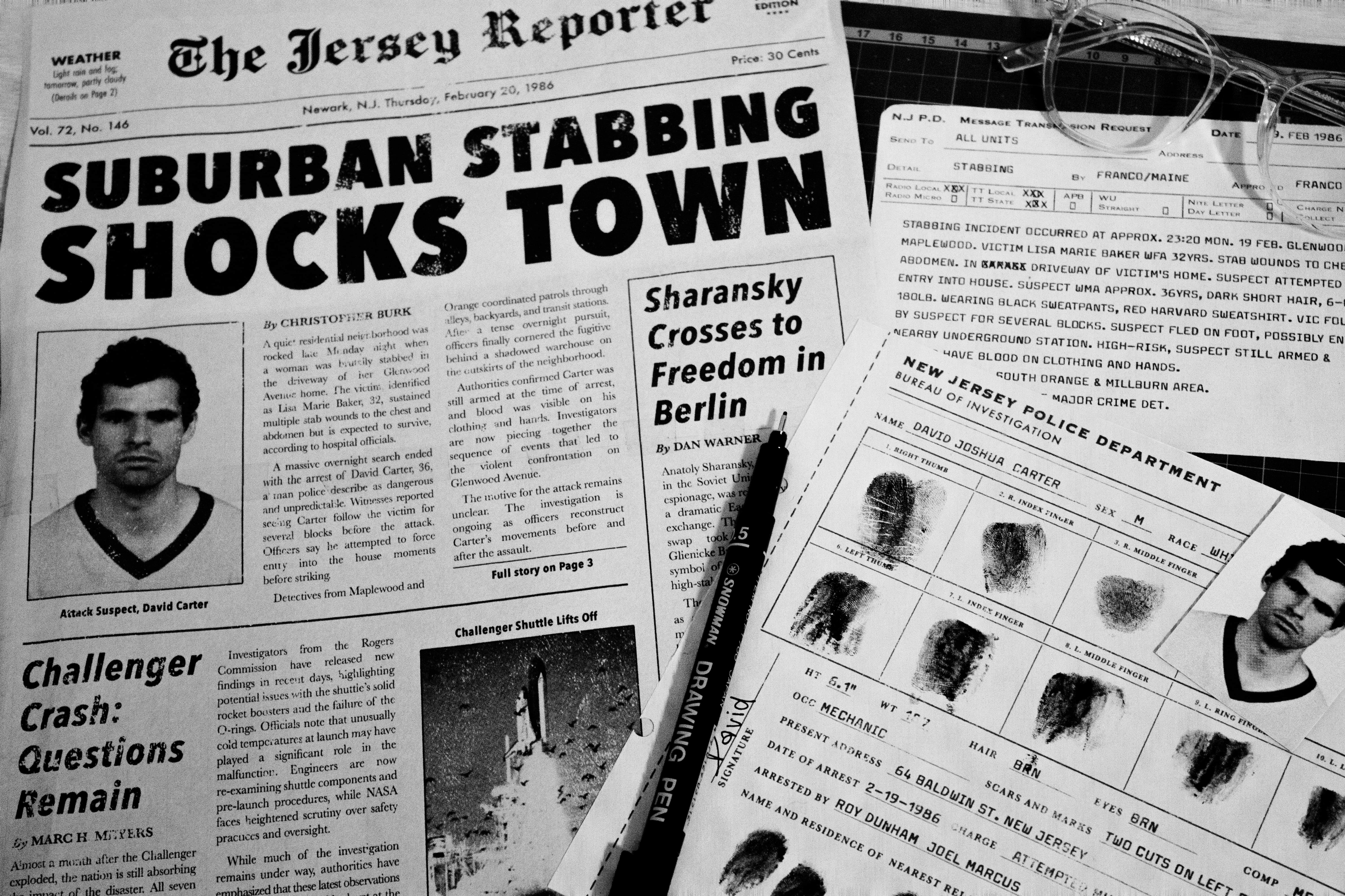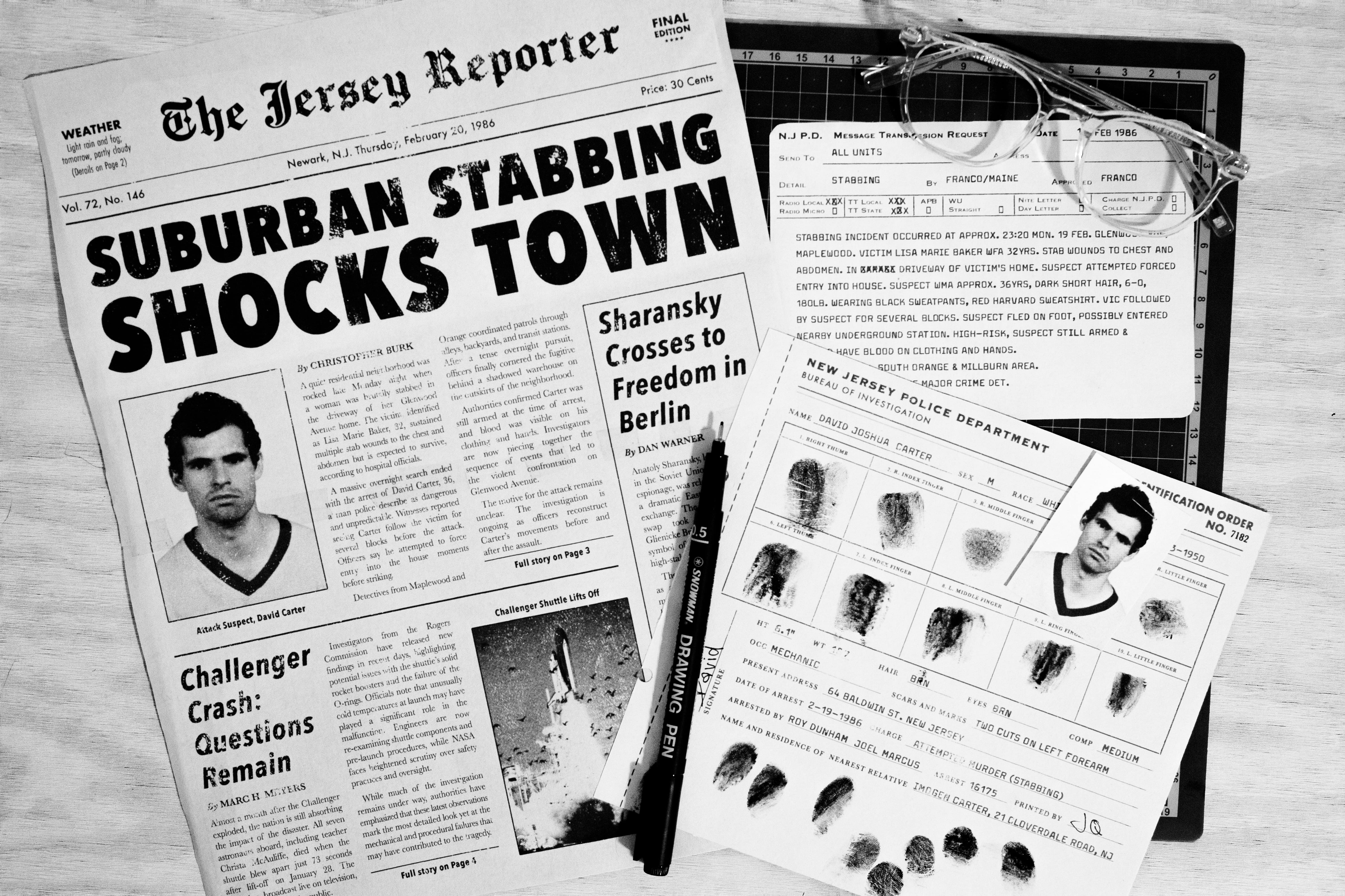 Set in February 1986, a brutal crime in a quiet New Jersey neighborhood becomes the centerpiece of a fictional crime story. To build the world around it, I designed three key artifacts: a chilling front-page newspaper, a police all-points bulletin warning of the fugitive on the run, and an arrest record documenting his capture, mugshot, and fingerprints.